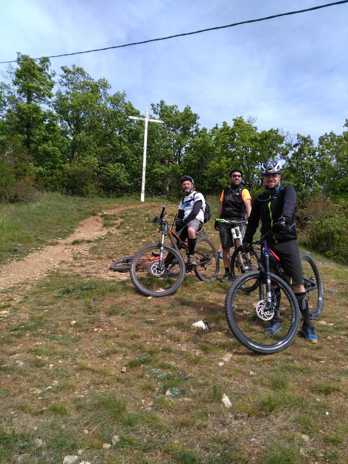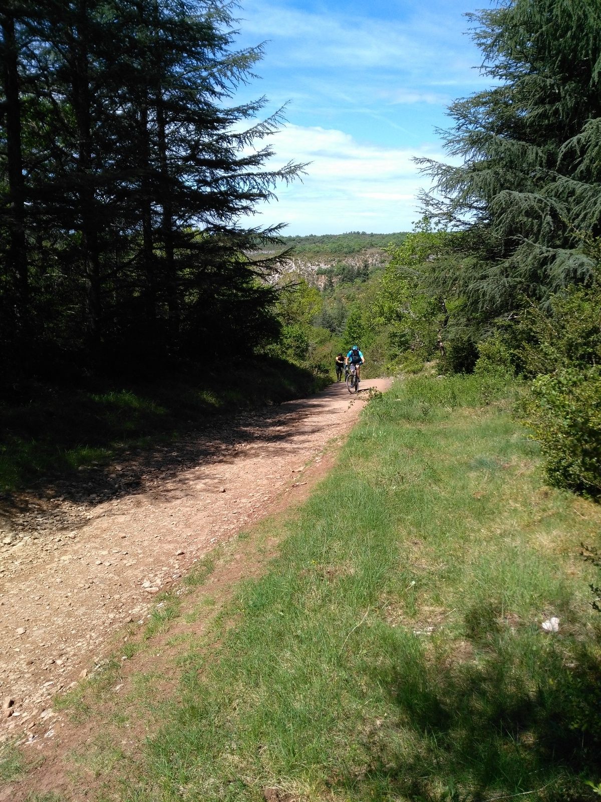 Là, commence la rouge par une grosses piste (stand de tir) montant au niveau du plateau d'Anglars. C'est la dernière grosse difficulté du parcours (m'en fout j'ai encore 4 diodes). Puis singles sympas en sous-bois et petites routes. Il est 14H, les ventres commencent à ruminer, On rentre par la route les 3 derniers km.